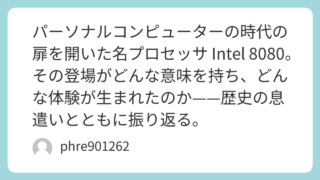 パーソナルコンピューターの時代の扉を開いた名プロセッサ Intel 8080。その登場がどんな意味を持ち、どんな体験が生まれたのか——歴史の息遣いとともに振り返る。 1970年代半ば、コンピュータは大学や大企業の専用機だった時代に、汎用性の高い8ビットCPUとして Intel 8080 が1974年に登場した。前世代の単機能チップとは違い、一般用途のプログラムが走る「本物のマイクロプロセッサ」として評価... 2026.03.14 未分類