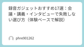 録音ガジェットおすすめ17選:会議・講義・インタビューで失敗しない選び方(体験ベースで解説) 「録音ガジェット、結局どれが正解?」って悩むのは、録音って“買った瞬間に勝ち”じゃなくて、現場でちょっとしたミスが起きやすいから。スマホで録ったら声が遠い、机の振動がうるさい、途中で途切れて終わった…このへん、わりと普通に起きる。だからこそ... 2026.01.21 未分類
