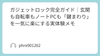 ガジェットロック完全ガイド|玄関も自転車もノートPCも「鍵まわり」を一気に楽にする実体験メモ 「ガジェットロック」で検索してる人って、たぶん“鍵まわりの小さなストレス”が積もってきてる。玄関でモタつく、荷物で手がふさがる、宅配でいちいち鍵を取りに行く、自転車を置くたびにちょっと不安、カフェで席を立つのが怖い。そういうのを一発で消して... 2026.01.21 未分類