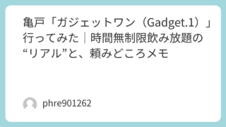亀戸「ガジェットワン(Gadget.1)」行ってみた|時間無制限飲み放題の“リアル”と、頼みどころメモ 「ガジェット ワン」で調べる人って、だいたい同じ気持ちだと思う。長くしゃべれて、会計が読めて、できれば終電までいける店ない? ってやつ。で、亀戸の「ガジェットワン(Gadget.1)」は、そこにかなり寄ってる店だった。時間無制限飲み放題を前... 2026.01.21 未分類