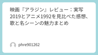 映画『アラジン』レビュー:実写2019とアニメ1992を見比べた感想、歌と名シーンの魅力まとめ 映画『アラジン』は、観る前は「有名だし、いつか観よう」で止まりがちなのに、一度観るとしばらく余韻が残るタイプの作品だった。しかも厄介なことに、実写(2019)とアニメ(1992)で“刺さる場所”が少し違う。どっちが正解というより、どっちも強... 2026.01.21 未分類