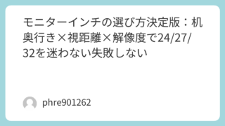 モニターのインチ選びは、好みだけで決めるとだいたい外す。先に決めるべきは「机の奥行き」と「目から画面までの距離」、ここが合うと24インチも27インチも32インチもすんなり決まる。理由は単純で、画面が大きいほど視線移動が増え、近すぎると首と目...