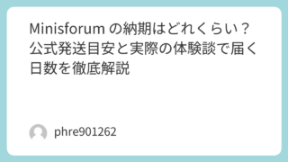 はじめにミニPCの中でも注目を集めている Minisforum。そのコンパクトなサイズと高い性能が魅力ですが、気になるのは「納期」。公式サイトで提供されている納期目安だけではなく、実際に購入した方々の体験談を交え、納期に関するリアルな情報を...
