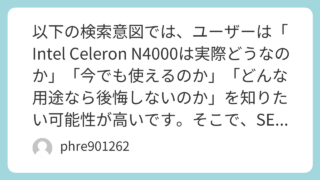 【SEOに最適な記事構成案】Intel N4000とは?まずはスペックを簡単に整理Intel N4000でできることIntel N4000では厳しいこと実機レビュー・利用者の体験談から見えたリアルChromebookとWindowsノートで...